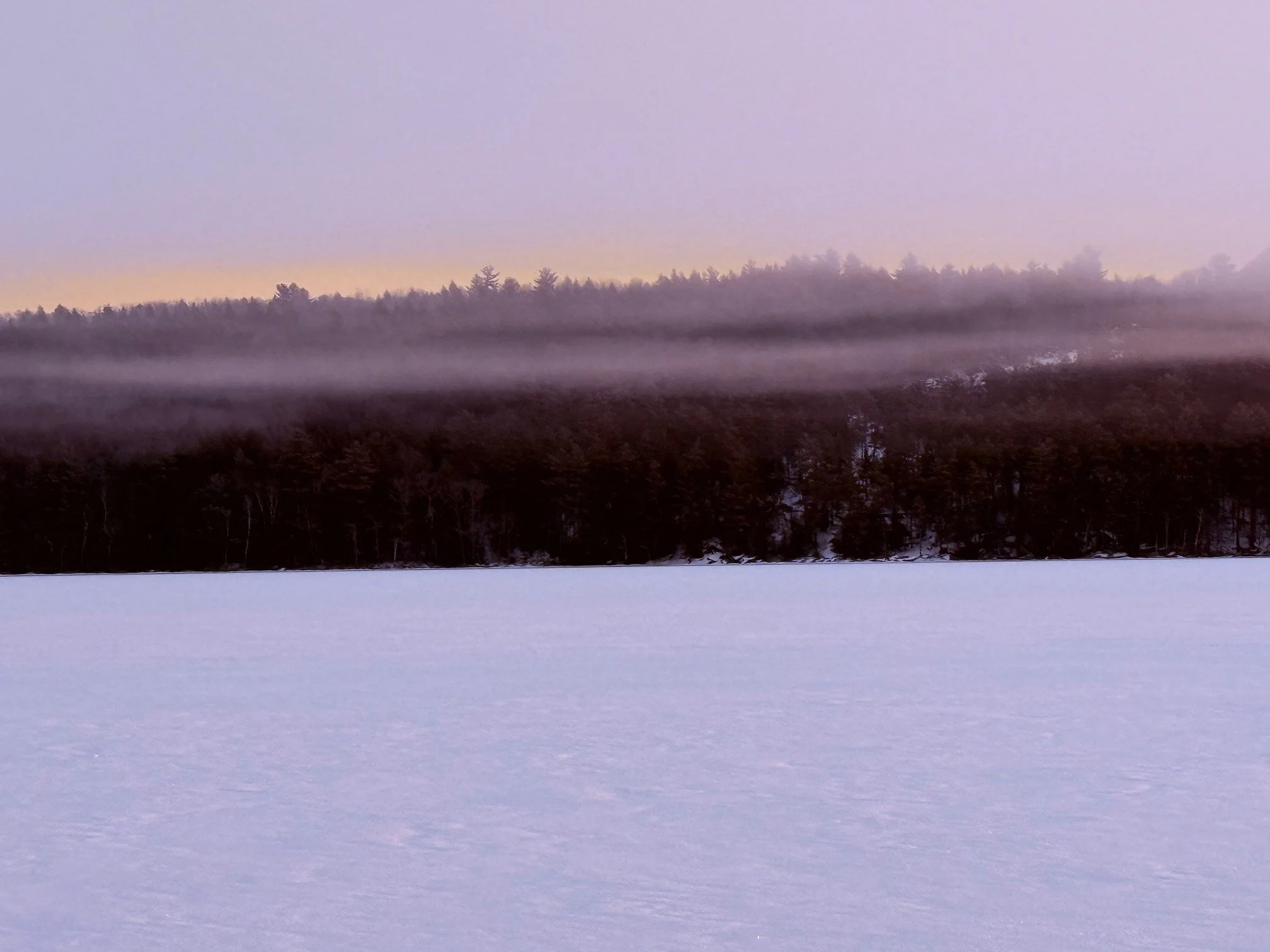 Frozen lake in winter with low morning fog drifting across a tree-lined shoreline under soft pastel sky. Photography by Charissa Simmons