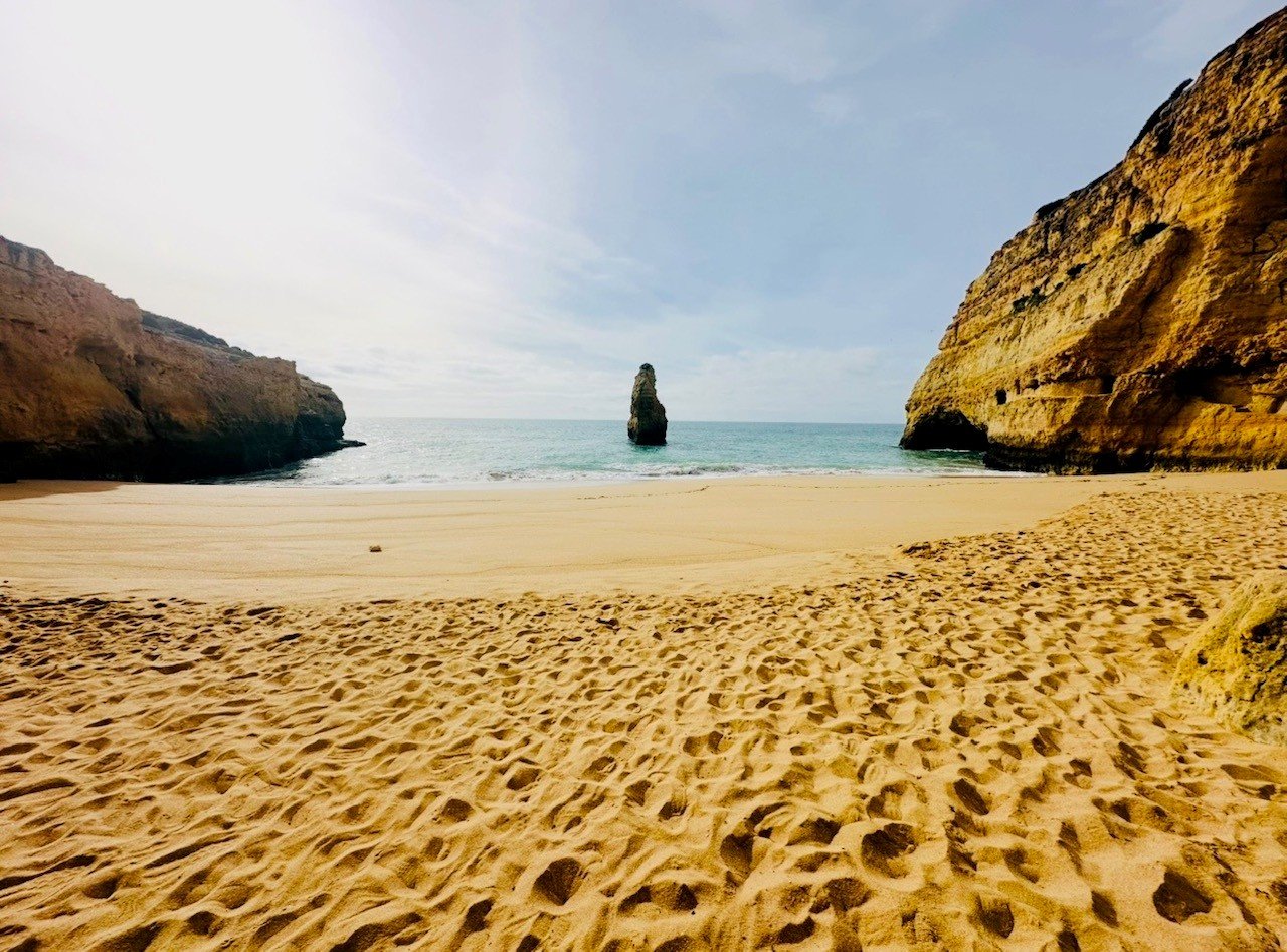 Sandy shoreline framed by rocky cliffs, opening toward calm ocean water. Photograph by Charissa Simmons