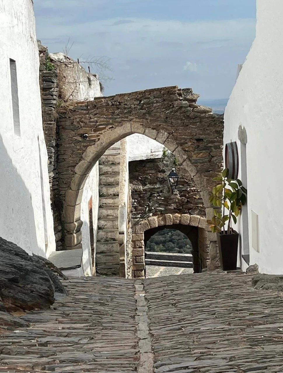 A weathered stone arch spans a cobblestone walkway between white buildings, opening into a quiet passageway beyond. Photograph by Charissa Simmons