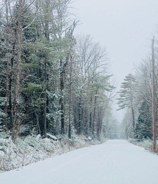 A snow-covered road stretching forward through a quiet forest, softened by winter light. Photograph by Charissa Simmons