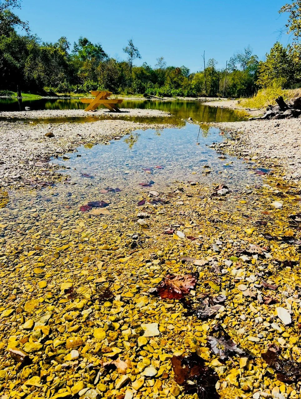 Shallow water moving across a rocky streambed, reflecting trees and blue sky along a calm shoreline. Photograph by Charissa Simmons