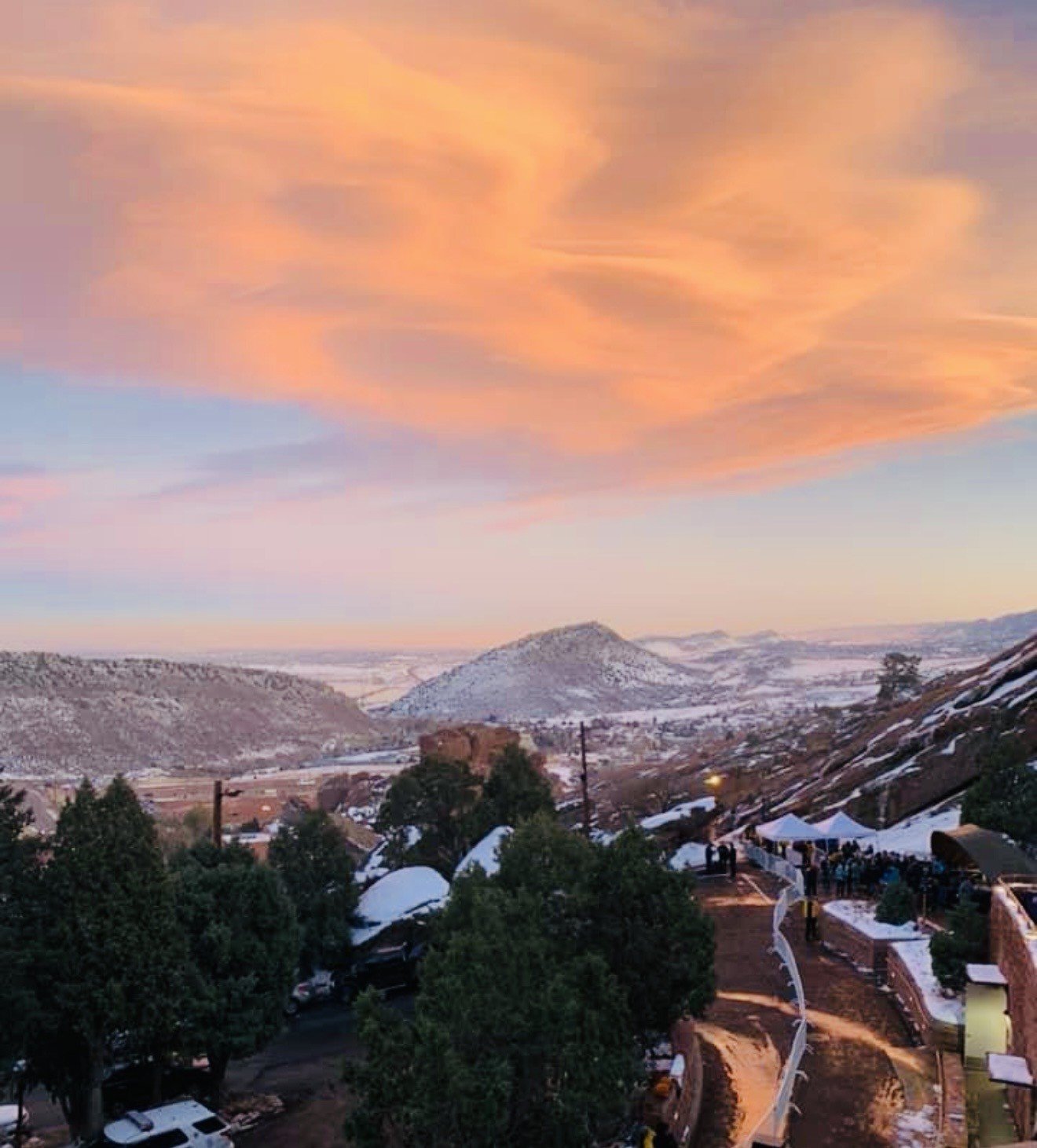 A winter landscape stretches into the distance beneath vivid orange clouds at sunset. Photograph by Charissa Simmons