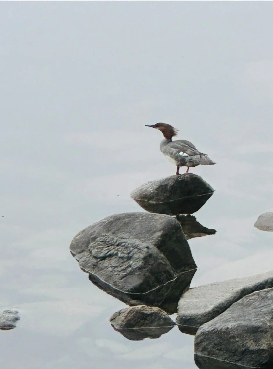 Merganser standing on a rock above still water. Photograph by Charissa Simmons