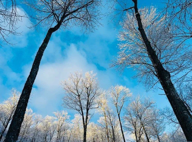 Bare winter trees reaching upward against a wide blue sky, creating intersecting lines and open spaces. Photograph by Charissa Simmons